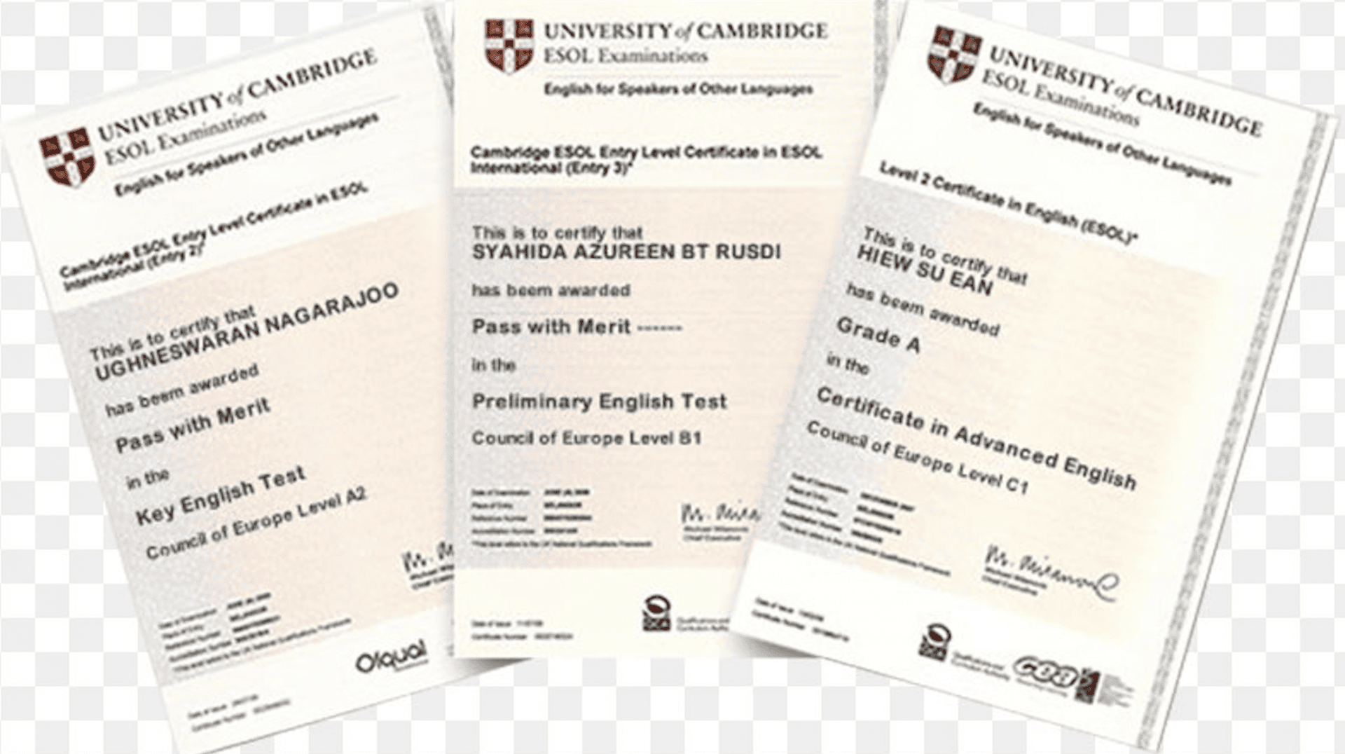 Khả năng anh ngữ của thí sinh sẽ được Hội Đồng Khảo Thí Tiếng Anh Cambridge thẩm định và cấp chứng chỉ bởi Trường Đại học Cambridge. Kết quả thi sẽ được công bố tại Trung Tâm Ngoại Ngữ Biên Hòa- Chương Trình Anh Văn Cambridge khoảng 6 tuần kể từ ngày thi.
